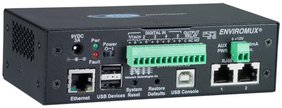 The ENVIROMUX® Small Enterprise Environment Monitoring System monitors critical environmental conditions (such as temperature, humidity, and water leakage) that could destroy network components in your server room. When a sensor goes out of range of a configurable threshold, the system will notify you via email, SNMP traps, web-page alerts, a visual indicator (red LED), voice phone calls (via Automatic Voice Dialer System), and SMS messages (via USB 3G modem).