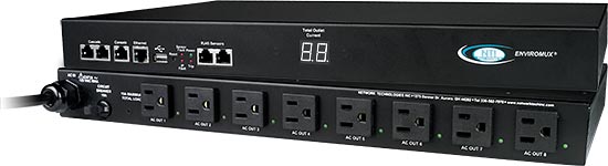 The ENVIROMUX® Secure Remote Power Control Unit allows you to remotely reboot and control power (on/off) to up to eight servers or other powered devices from any location via secure web interface, RS232, SSH, or Telnet.