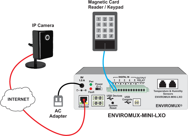 Card reader or keypad must have output relays that will activate on desired events, such as failed entry, successful entry, forced entry, etc. Connect output relays to the ENVIROMUX-MINI-LXO digital inputs. Access the web interface to configure IP camera and alert settings. Under Monitoring > IP Cameras, select "Configure IP Cameras" to add desired IP camera address. Select Digital Input > Digital Input Configuration and choose the corresponding output relay connections. Set-up appropriate alert settings and ensure that "Enable E-mail Alerts" and "Attach IP camera capture to email" are checked and the desired IP camera is selected; for example, if digital input #1 is normally-open, an email alert and IP camera snapshot should trigger if it is closed. Check that all user and email alert settings are correct.
